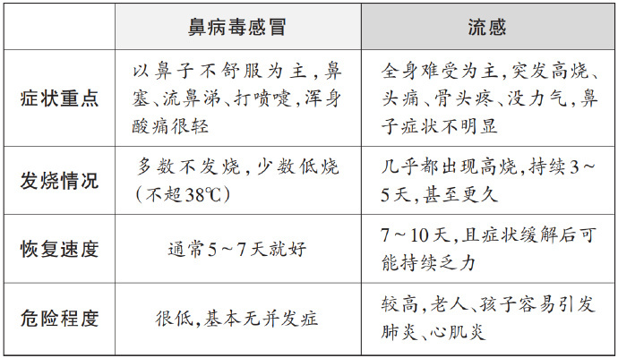 不过,鼻病毒感染有两个较为良性的特点:①发热较少见或仅为低热;②一般5~7天可自行好转,很少进展为肺炎等严重并发症。很多人容易将鼻病毒感冒误认为流感,从而错误用药或过度焦虑。这里提供一个简单的区分思路:若以鼻部症状为主,全身症状较轻,多为鼻病毒感冒;若急起高热、全身酸痛、乏力明显,则需警惕流感。
